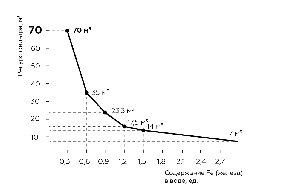 *При повышенных значениях железа (Fe) ресурс можно определить по графику на рис. 2